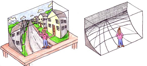 “[W]e are living in a scale model, and the scale of the model shrinks progressively with depth, just like a museum diorama, or a theatre set. And at the back plane the scale shrinks to zero, at least in the depth dimension, where everything beyond a certain distance appears flat, as if painted on the dome of the sky. But it only looks that way. It’s an illusion. We know that the world isn’t really warped like that.” Reprinted with permission from “Cartoon Epistemology” by Steven Lehar, p. 12.