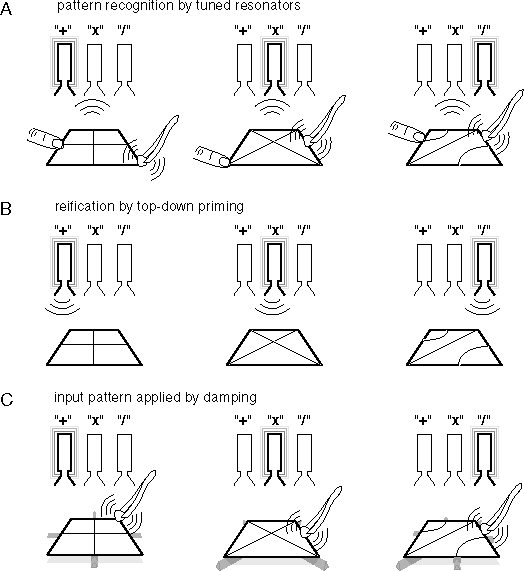 “A: A bank of tuned resonators tuned to the frequency of three specific standing wave patterns are coupled to the plate to behave as feature detectors, that become active whenever their pattern of standing waves is present on the plate. B: The system automatically performs reification with recognition, for the activation of any of the resonators regenerates its characteristic standing wave pattern back on the plate. C: If the plate is resting on rubber ridges in the form of one of the standing wave patterns, the ridges behave as an input pattern, forcing the resonance on the plate to conform to the pattern of the input.” Reprinted with permission from “Harmonic Resonance Theory” by Steven Lehar.