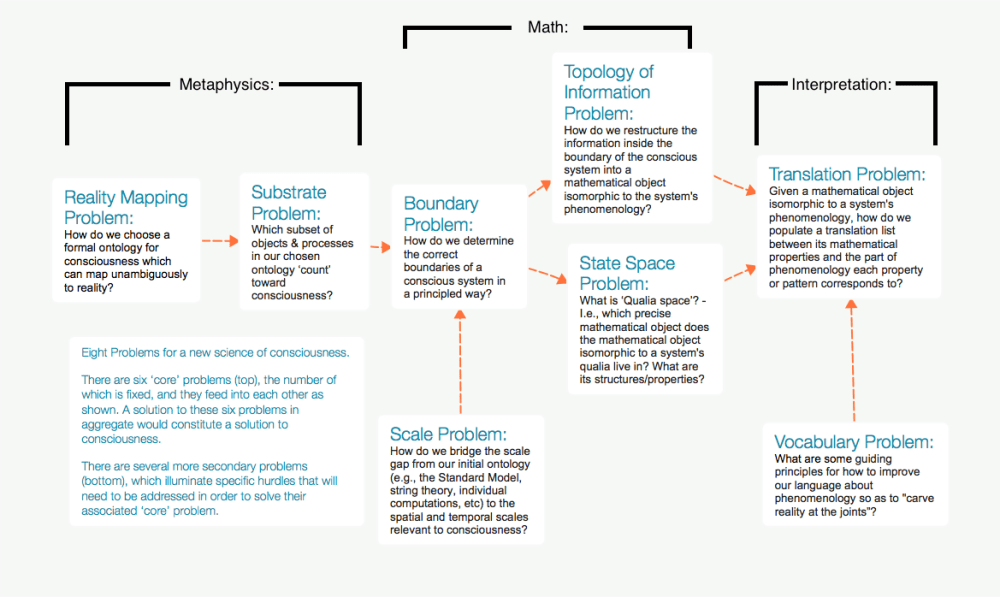For clarification, I should point out that what is brilliant (IMO) about Mike’s Principia Qualia is that he breaks down the problem of consciousness in such a way that it allows us to divide and conquer the hard problem of consciousness. Indeed, once broken down into his 8 subproblems, calling it the “hard problem of consciousness” sounds as bizarre as it would sound to us to hear about “the hard problem of matter”. We do claim that if we are able to solve each of these subproblems, that indeed the hard problem will dissolve. Not the way illusionists would have it (where the very concept of consciousness is problematic), but rather, in the way that electricity and lightning and magnets all turned out to be explained by just 4 simple equations of electromagnetism. Of course the further question of why do those equations exist and why consciousness follows such laws remains, but even that could IMO be fully explained with the appropriate paradigm (cf. Zero Ontology).